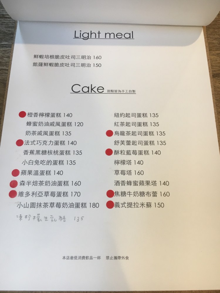 菜單。紅點標示的是當天有的甜點。