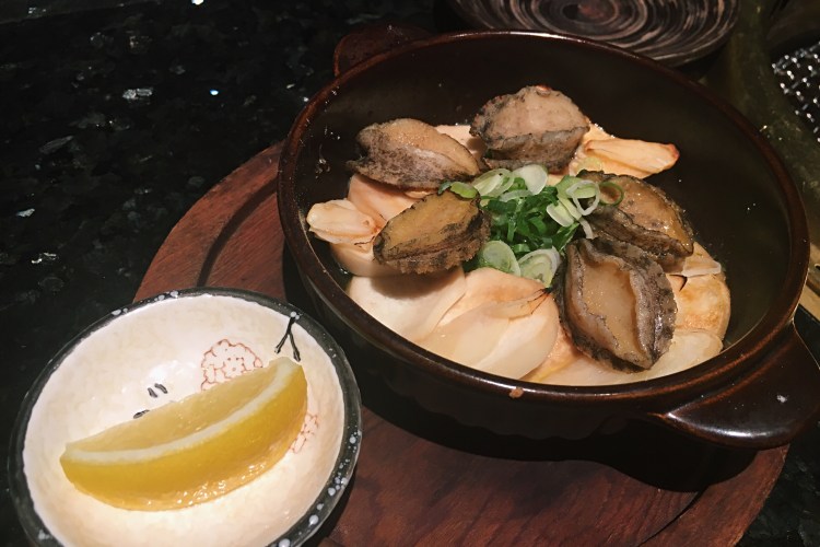 蒜香奶油九孔燒(320元)。熟透的蒜溫和不嗆,新鮮九孔彈性極佳卻不過韌難咬,醬汁與法式烤田螺的醬汁味道很像。