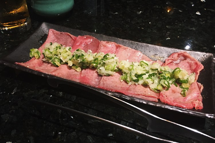 炙燒鹽蔥香牛舌。薄片牛舌(另一種牛舌切比較厚),稍有嚼勁但不須太多咀嚼。