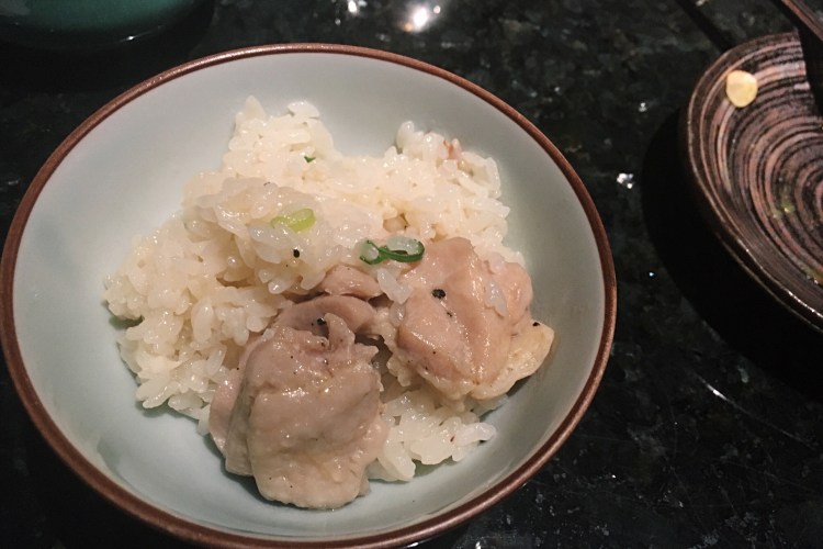 雞釜飯(小份250元)。老乾杯的釜飯選用日本北海道產的七星米,此米連續五年獲得日本穀物檢定協會最高平價特A賞。釜飯選擇眾多,最後選了服務生推薦,據聞最受歡迎的雞釜飯。