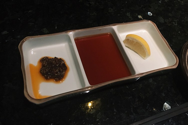 醬料共有三種,檸檬、醬油還有店家自製七味醬。七味醬混合了芝麻、香油、花椒等等,味道很香。