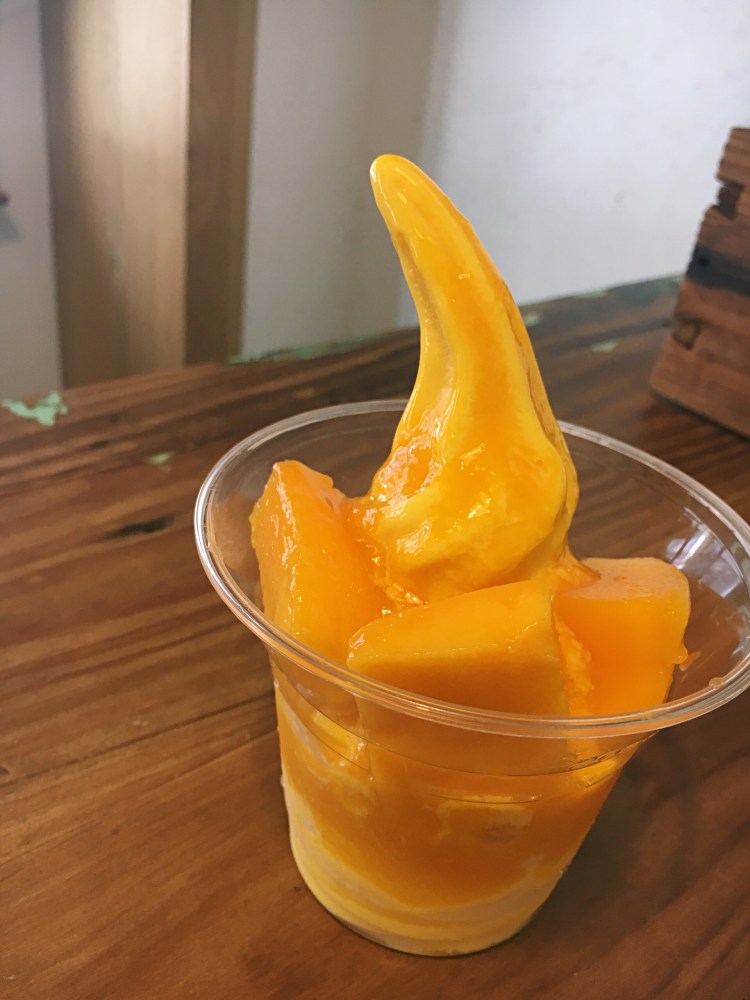 愛文芒果霜淇淋(150元,好像是)。登登登登登美麗無邊的霜淇淋登場啦!(照太多張了原本直挺的霜淇淋變得有點懨嗒嗒)芒果愛好者沐浴在聖光中幸福到窒息!天啦嚕!太好吃啦!霜淇淋滿滿芒果香氣,上頭附的果肉又香又甜又多汁,台灣芒果世界第一無人能敵已經升天,喔倘佯在芒果雲海中,高歌讚頌聖曲,喔喔喔喔喔喔喔好幸福喔喜極而泣。(格主抽風已拖走)