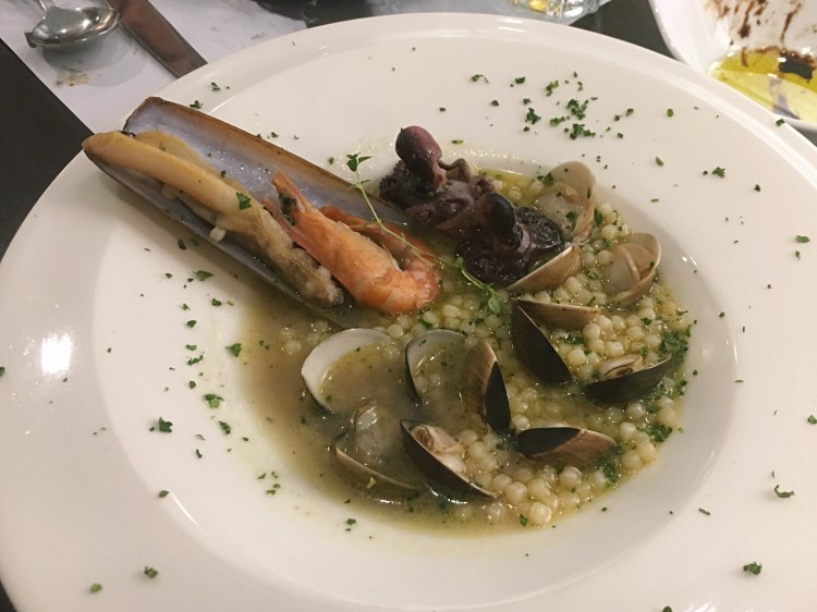 薩丁尼亞海鮮珍珠麵 Fregola sarda ai frutti di mare(480元)。珍珠麵是薩丁尼亞的主食之一,用麵粉揉製而成,因外型的關係常被誤認為米。口感很特別,搭著濃濃海鮮味的清湯汁。