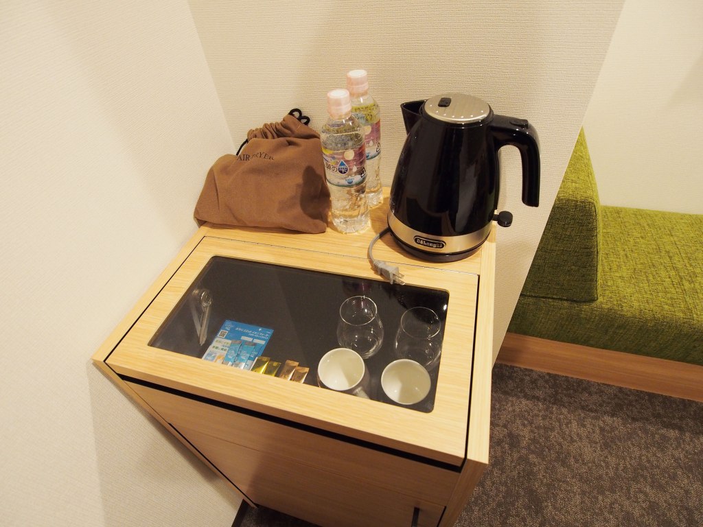茶包和杯子等等,底下櫃子裡有小冰箱。