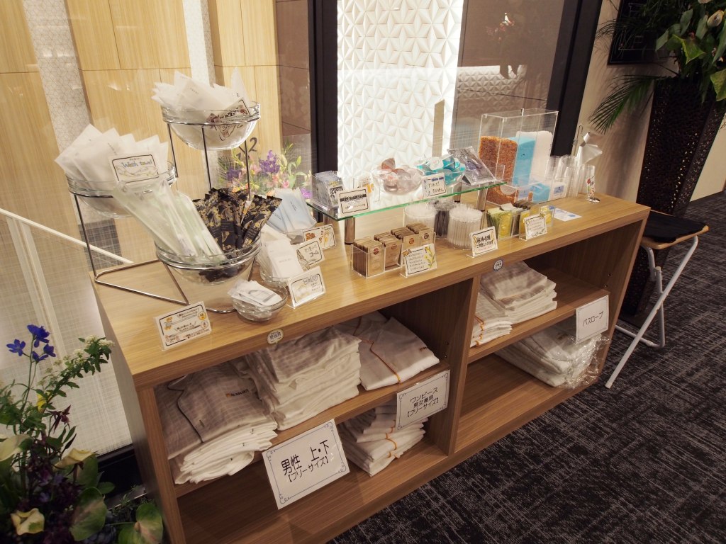 大廳有個放各種類盥洗與浴衣的櫃子讓人自取,種類挺多的,甚至還有面膜。有三種泡澡海鹽可以選,用一旁的小杯子高高興興地裝了喜歡的上樓。