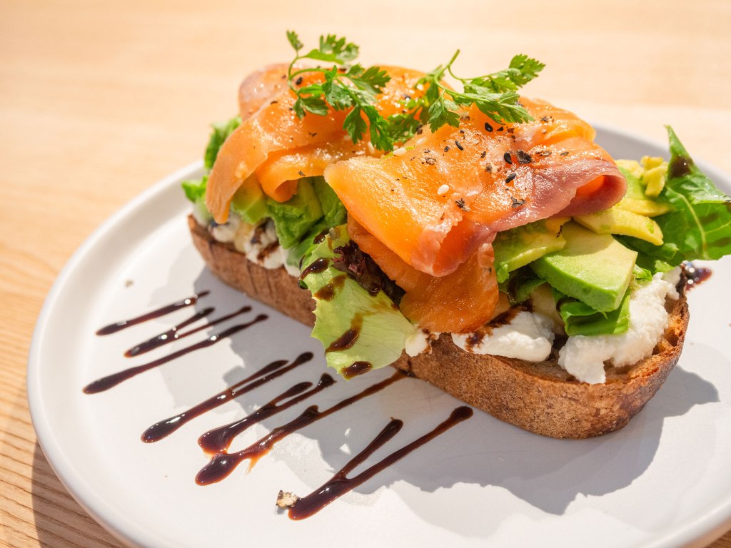 開放式三明治底下是酸麵包,比預期中硬度來的柔軟。燻鮭魚、酪梨、起司等,再淋上油醋,清爽健康,調味十分得宜。