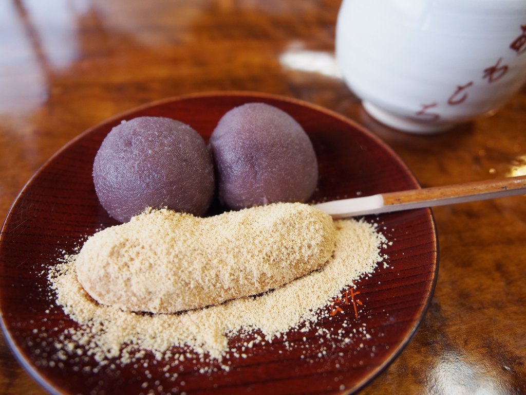 「粟」是小米之意,「粟餅」就是小米做成的麻糬。一份餐點裡有兩種麻糬,一種是裹著紅豆沙的糰狀麻糬,另一種是裹著黃豆粉的棒狀麻糬。